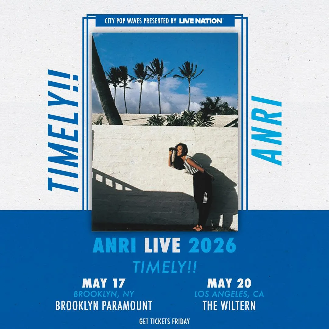 ANRI will return to the U.S. to perform live in May of 2026 as part of Live Nation’s City Pop Waves concert series. ANRI’s 2023 appearance in Los Angeles drew a phenomenal crowd of ecstatic fans - be sure to secure tickets during the presale and general sale starting on Friday, October 30th and Saturday, October 31st, respectively.