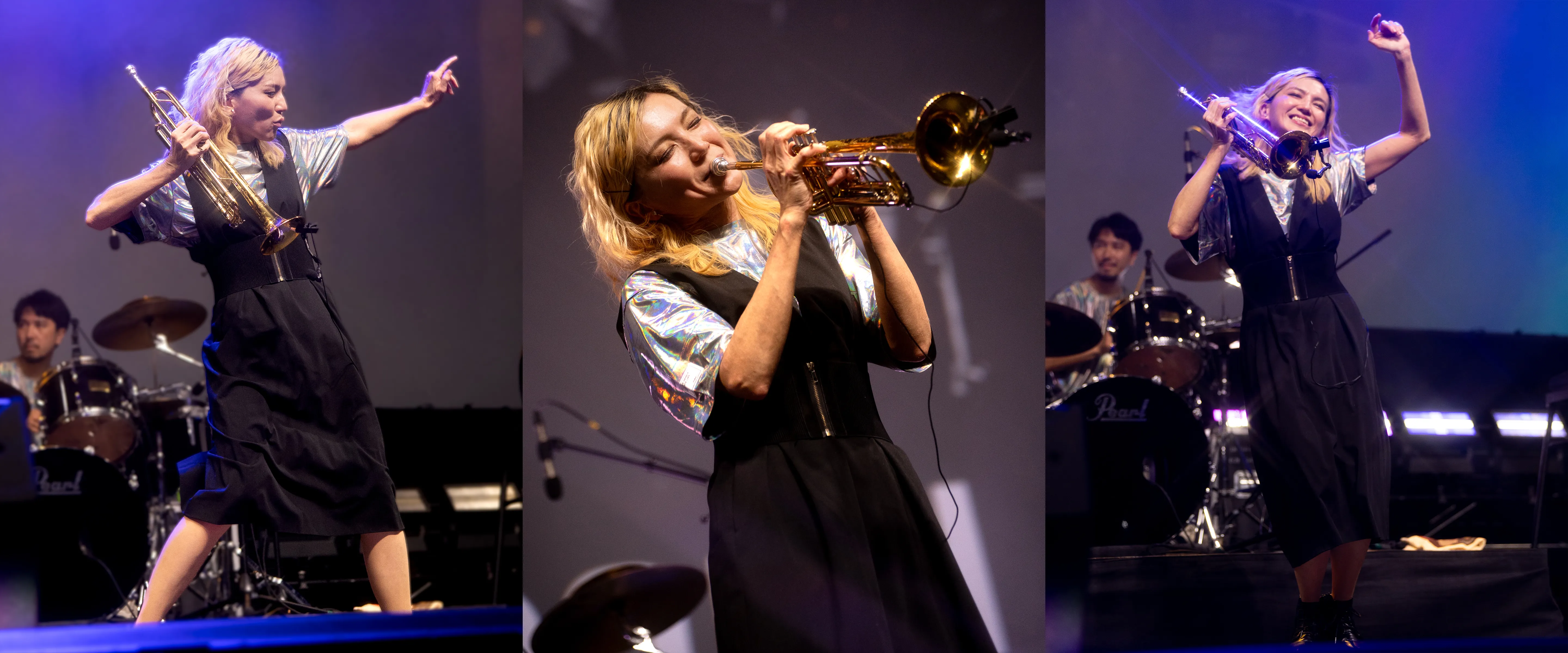 Trumpet player Chihiro is a nonstop ball of energy - when not showing off the fancy fingerwork on the trumpet, she shows off the fancy footwork by dancing and shuffling across the stage as the rest of the band plays.