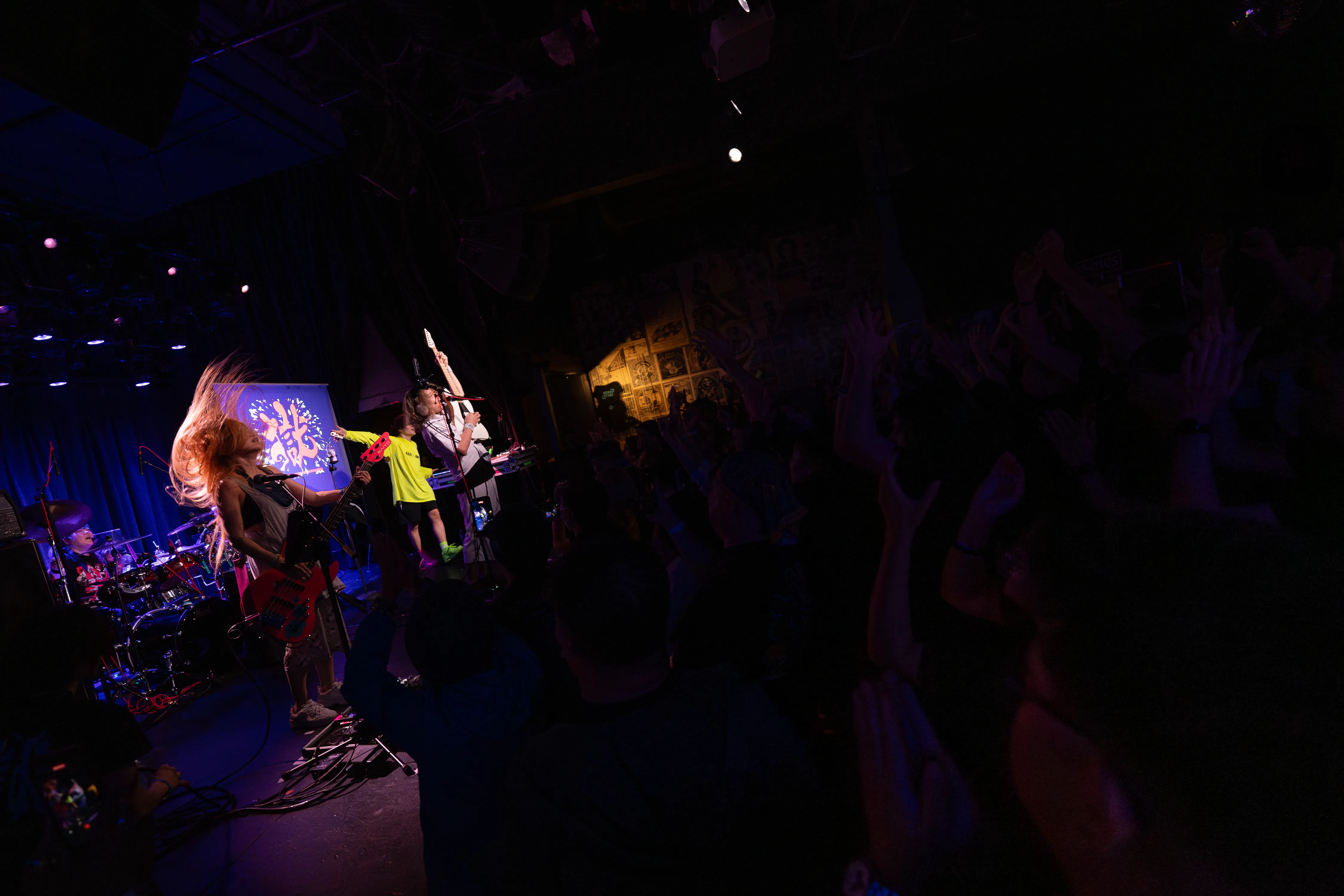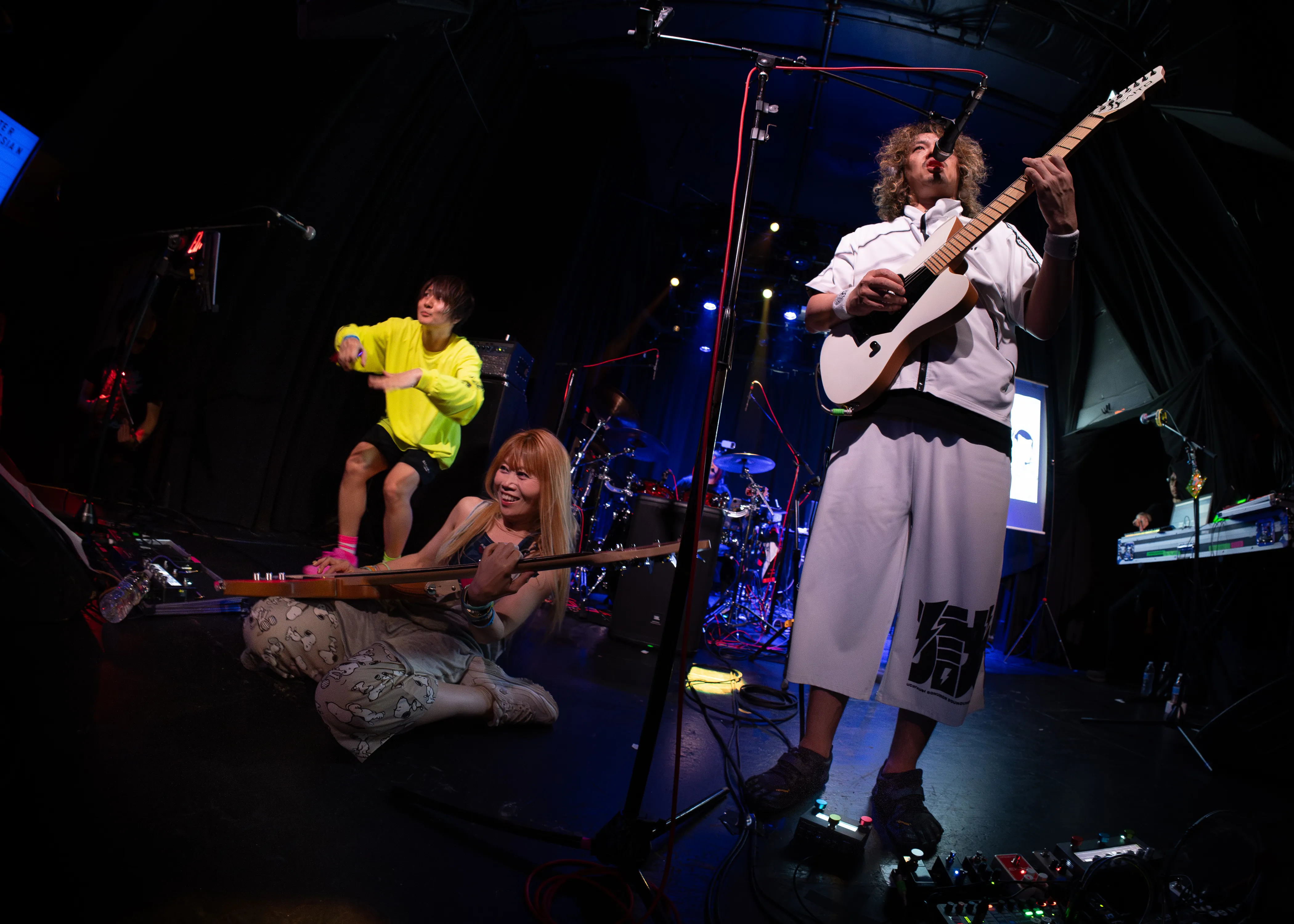 The Sunday night show started off loud and with plenty of audience participation as the band and audience did squat exercises together during “Kinniku My Friend” (“Muscle My Friend”). The sonic backbone of the set was anchored by Kaichou’s seven-string guitar and Junko’s five-string bass, a combination that gives Gokumon’s music a distinct low-end weight. Their sound is heavy, genuinely and physically heavy, and yet the band’s signature approach, which they call “Seikatsu Micchaku-gata Loud Rock,” or “Life-Immersed Loud Rock,” keeps it grounded in something universally relatable and whimsical. Songs about not wanting to get out of bed, cats, not wanting to go to work, rice, seafood, and so on.