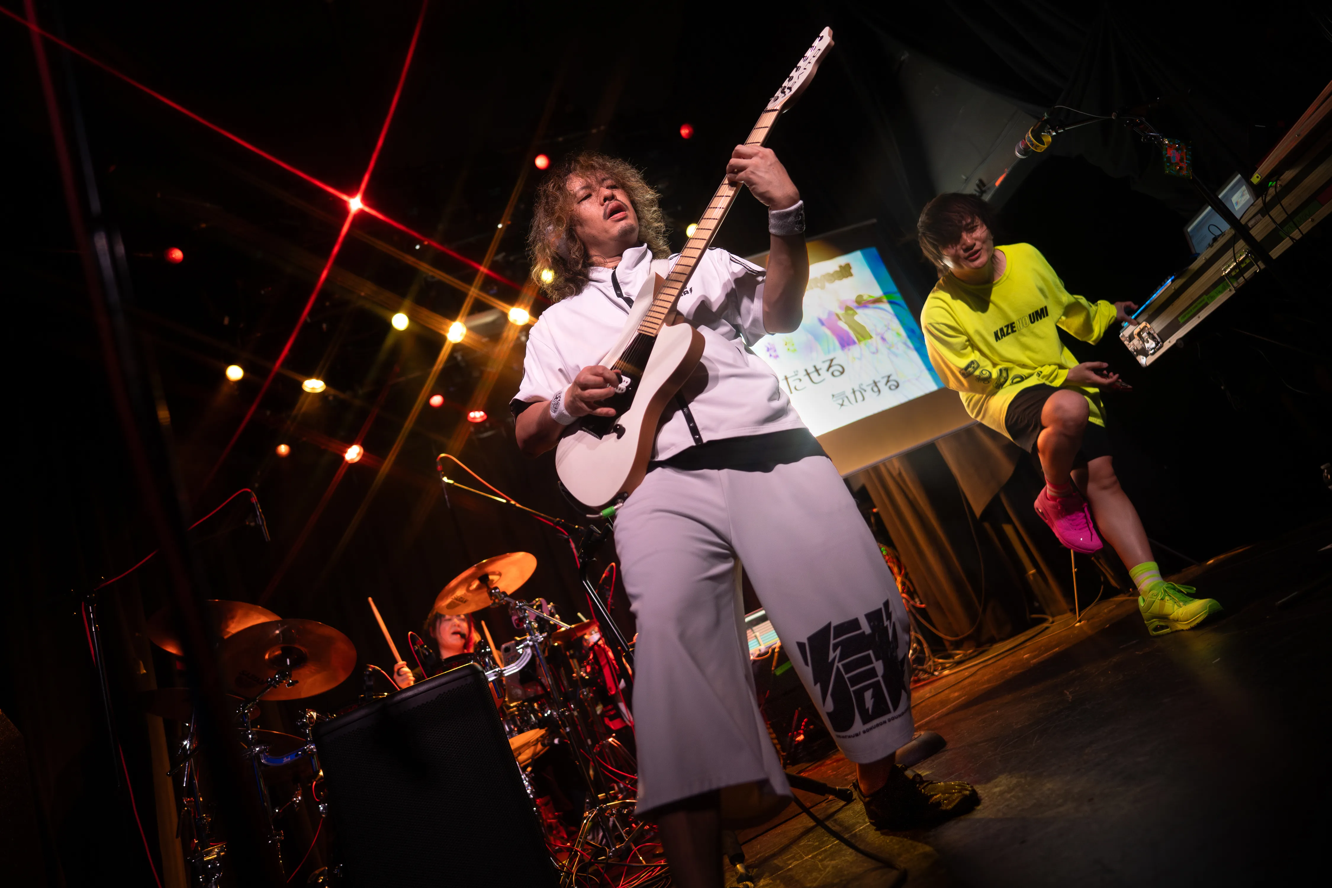 During the show, Kaichou was flanked on either side by Junko and Kazenoumi, who are both bursting with energy and basically never stop bouncing around the stage. Both are constantly headbanging, with Junko doing impressive hair flips with her extremely long locks, and Kazenoumi rocking out so hard his head comes close to the floor of the stage… all the while performing VJ duties on a stationary laptop and device with buttons as well as making use of a Famicom controller-shaped remote device.
