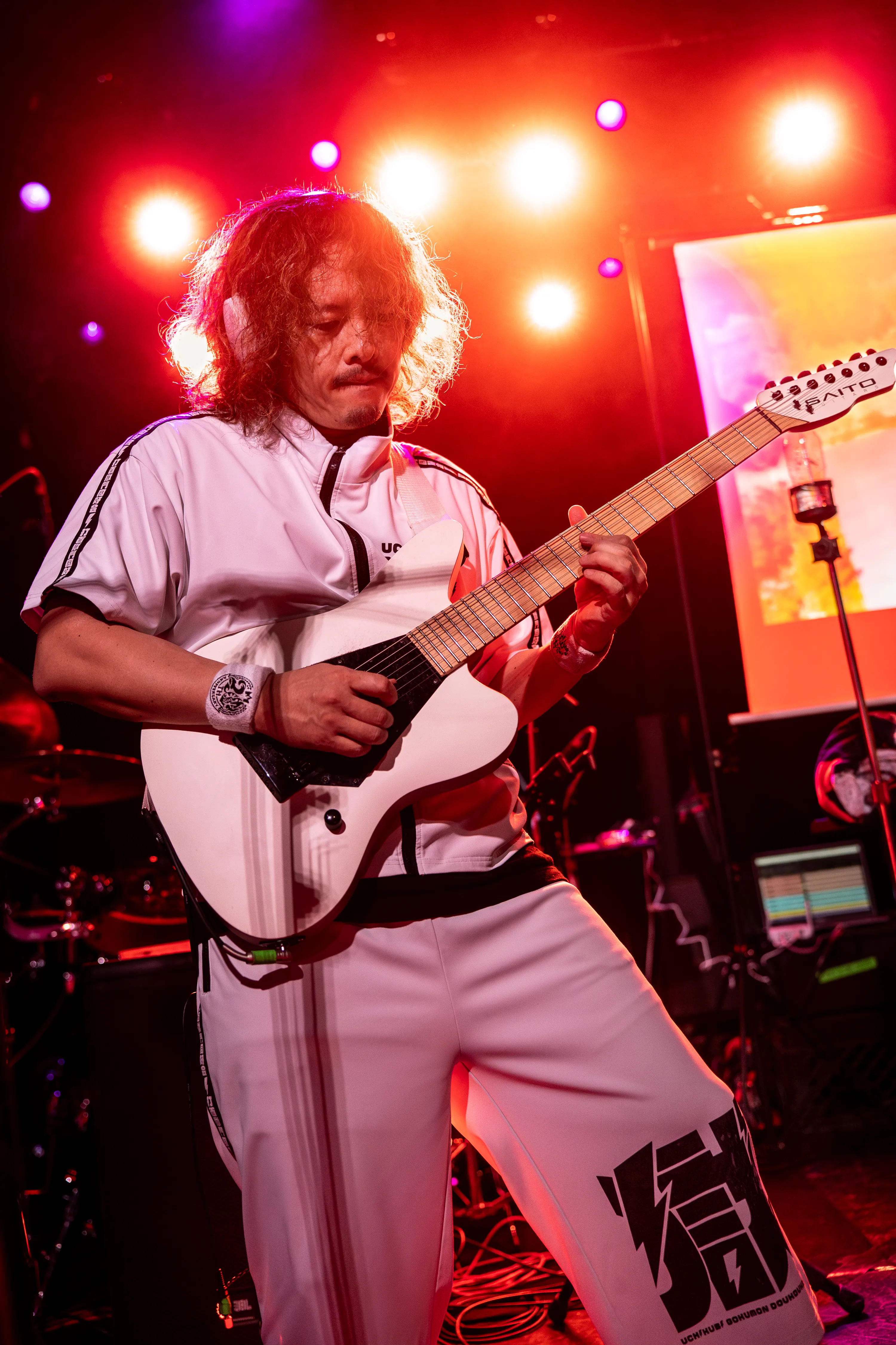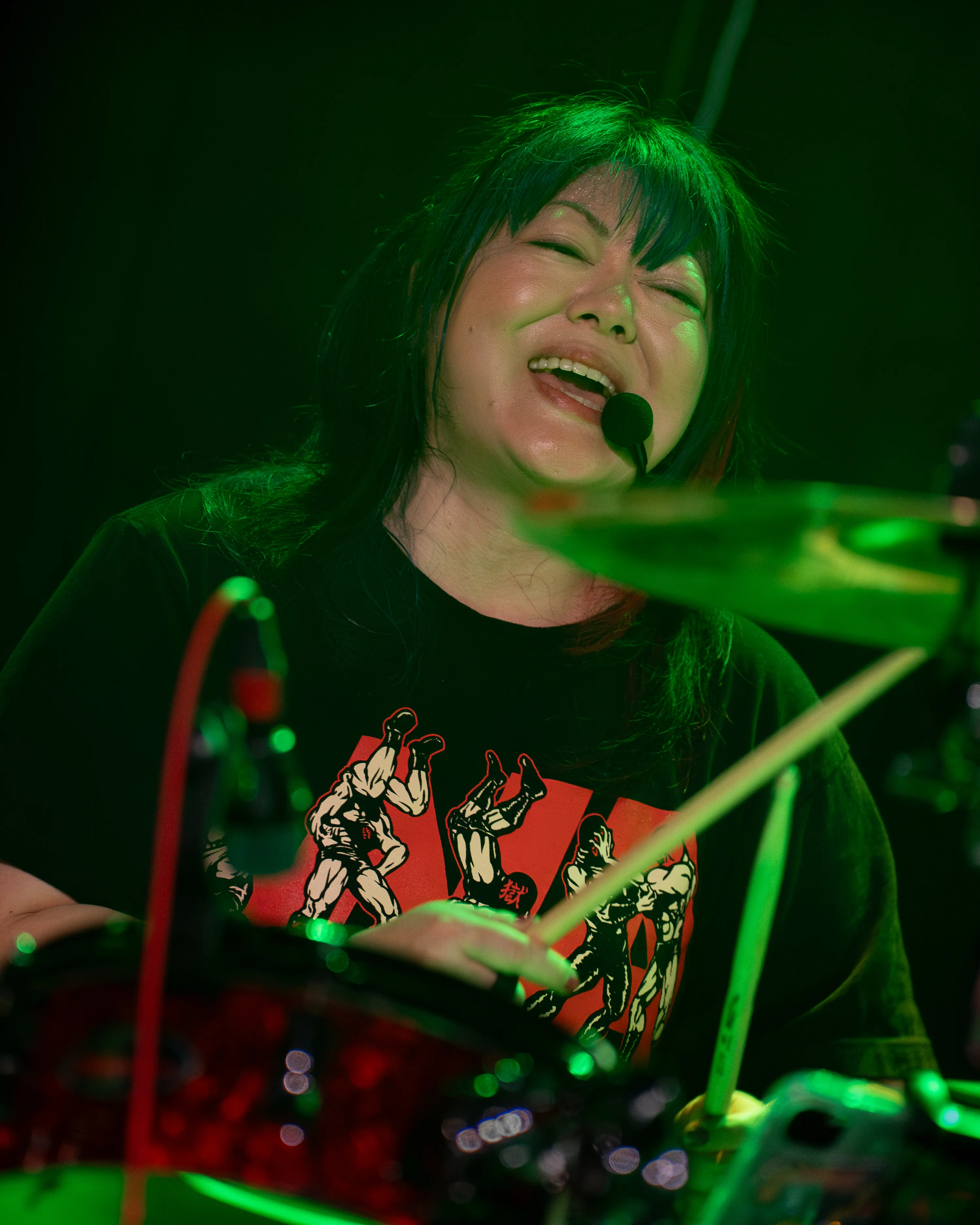 The Sunday night show started off loud and with plenty of audience participation as the band and audience did squat exercises together during “Kinniku My Friend” (“Muscle My Friend”). The sonic backbone of the set was anchored by Kaichou’s seven-string guitar and Junko’s five-string bass, a combination that gives Gokumon’s music a distinct low-end weight. Their sound is heavy, genuinely and physically heavy, and yet the band’s signature approach, which they call “Seikatsu Micchaku-gata Loud Rock,” or “Life-Immersed Loud Rock,” keeps it grounded in something universally relatable and whimsical. Songs about not wanting to get out of bed, cats, not wanting to go to work, rice, seafood, and so on.