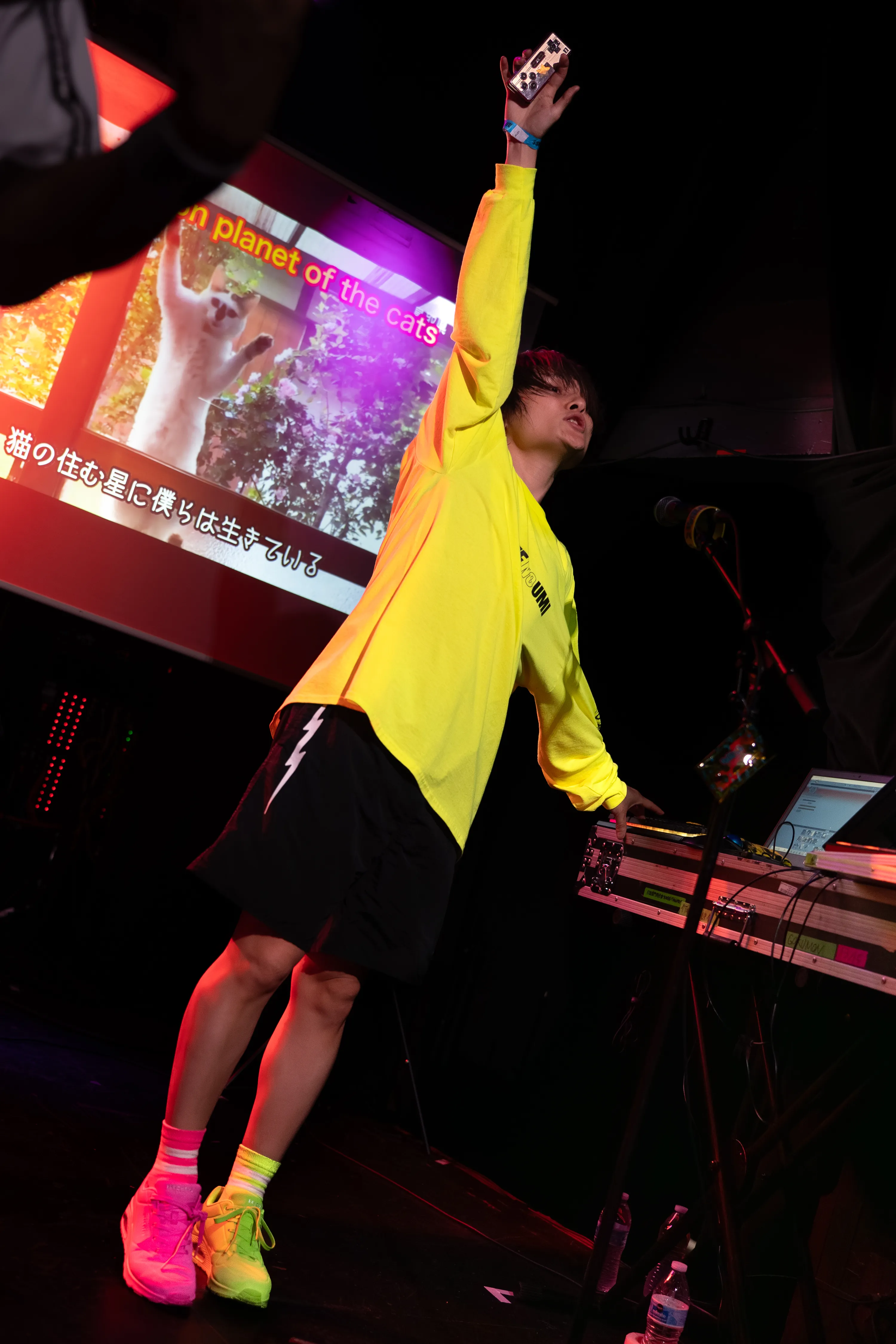 During the show, Kaichou was flanked on either side by Junko and Kazenoumi, who are both bursting with energy and basically never stop bouncing around the stage. Both are constantly headbanging, with Junko doing impressive hair flips with her extremely long locks, and Kazenoumi rocking out so hard his head comes close to the floor of the stage… all the while performing VJ duties on a stationary laptop and device with buttons as well as making use of a Famicom controller-shaped remote device.