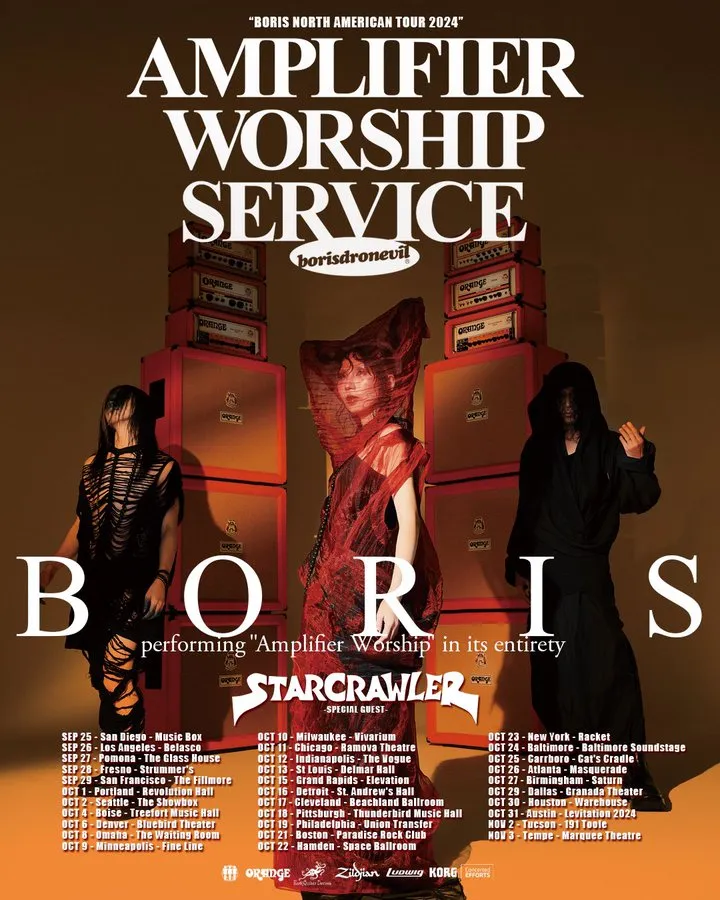 The Boris North American Tour 2024 “Amplifier Worship Service” begins on September 25th in San Diego, California. This 32-date tour includes a performance at the Levitation festival in Austin, Texas, on October 31st, concluding with a show in Tempe, Arizona, on November 3rd.