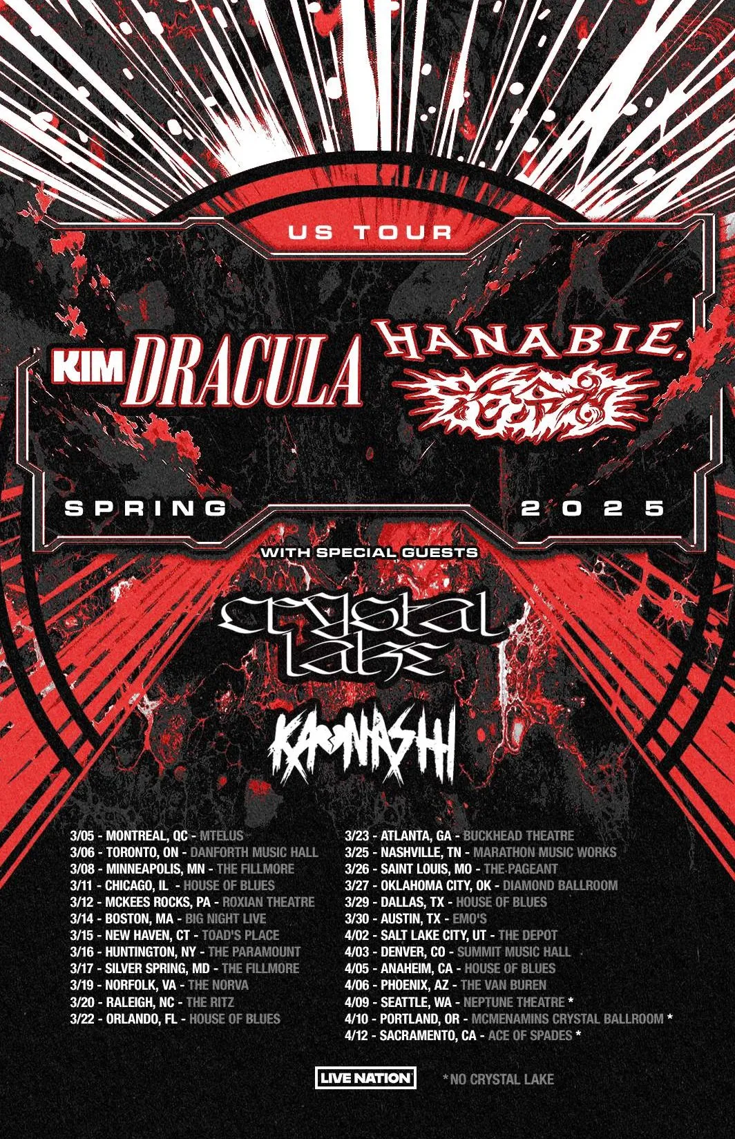 HANABIE. is a Japanese metalcore band from Tokyo, formed in 2015. They are renowned for their unique style, which they’ve dubbed “Harajuku-core,” a fusion of aggressive metalcore, hardcore punk, and nu-metal sounds with contrasting, vibrant Harajuku fashion aesthetics. The four-member band will join forces with Kim Dracula for a co-headlining tour across the U.S., first stopping in two Canadian cities.